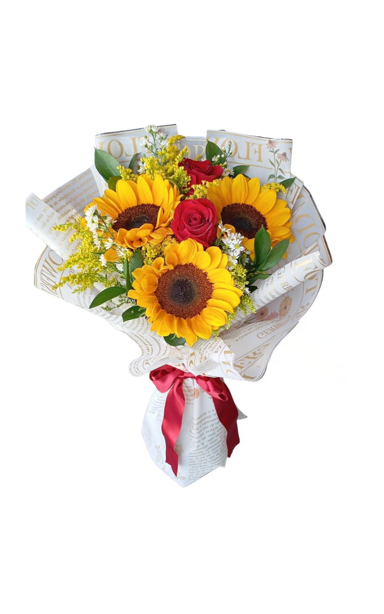 Um toque de Sol e Paixão para o sei dia! Buque composto por 3 girassói, 3 rosas