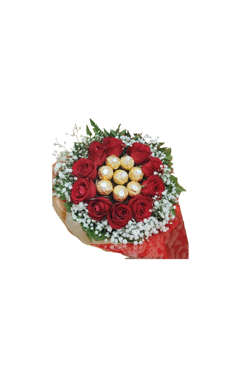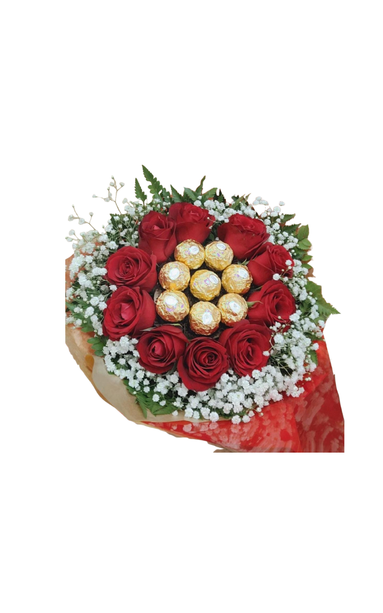 – 10 Rosas vermelhas naturais + – 8 chocolates Ferrero Rocher. – 1 Gipsofila – 1 Embalado com celofane e laço.